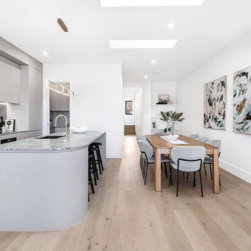Engineered European Oak a Classic range of timber floors built for every Australian home. Suitable for floating or direct stick installations, the Sunstar drop-lock system with wax finished joins provides a strong, quick and easy to lay strong flooring system. The multi-layer hardwood core creates a high-density structure backed by life-time structural warranty. Classic Sliced oak veneer layer achieves affordable and durable traditional oak finish.