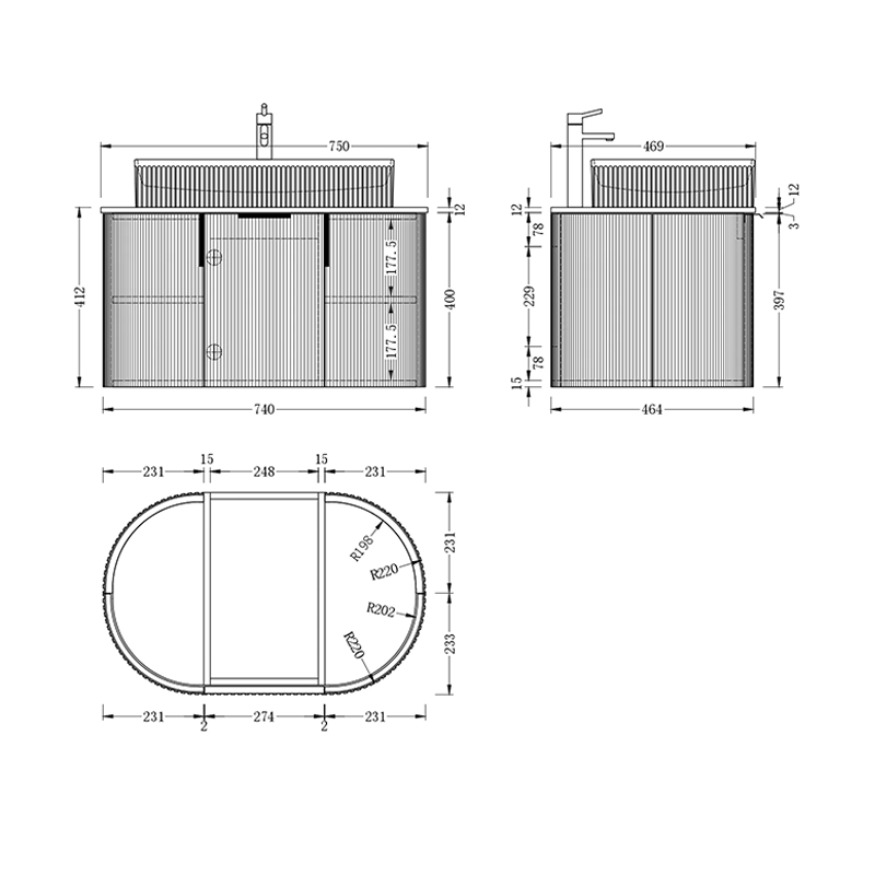 Carysil Fluted Wall Hung Vanity Walnut (Stone Top and Black Handle Included) 750mm is backordered and will ship as soon as it is back in stock.