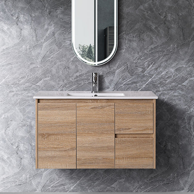 Sierra Series Wall Hung Left Hand Drawer Natural Timber 730x355x520mm Vanity with Ceramic Slimline Top (UV32)